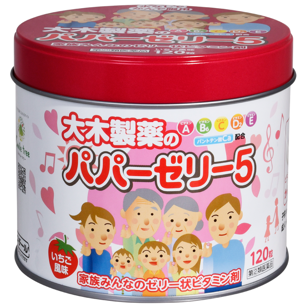 パパーゼリー5は、ビタミンA、B6、C、D2、Eとパントテン酸カルシウムを配合した、かんで容易に服用していただけるいちご風味の甘いゼリー状ビタミン剤です。発育期、偏食がちなお子さまやかぜなどの発熱や下痢などでぐったりしているときの栄養補給に。また、やわらかいので固いものが苦手なお年寄りの方にもおすすめできます。