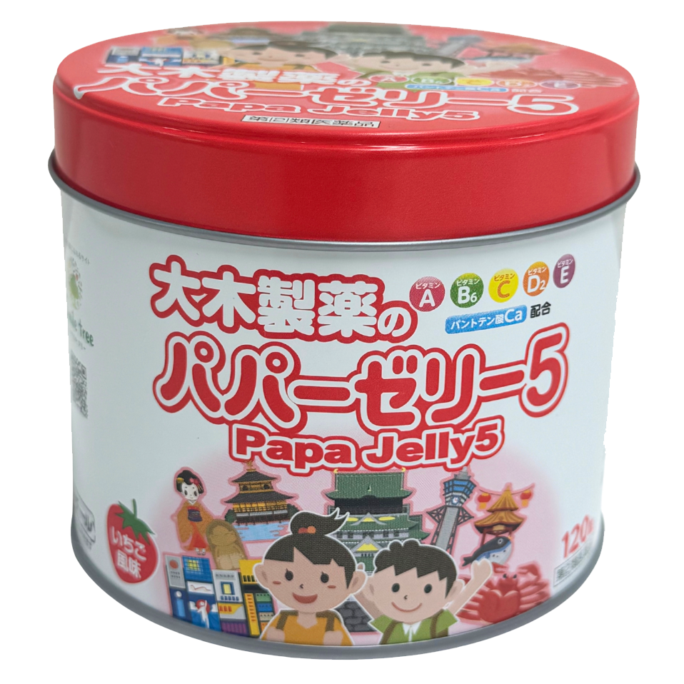 パパーゼリー5は、ビタミンA、B6、C、D2、Eとパントテン酸カルシウムを配合した、かんで容易に服用していただけるいちご風味の甘いゼリー状ビタミン剤です。発育期、偏食がちなお子さまやかぜなどの発熱や下痢などでぐったりしているときの栄養補給に。また、やわらかいので固いものが苦手なお年寄りの方にもおすすめできます。