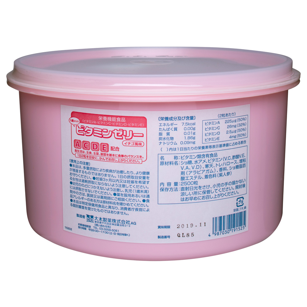 ショ糖、水あめ/ビタミン(V.C、V.E、V.B6、V.A、V.D)、寒天、増粘多糖類、香料、紅花色素、ショ糖エステル、水酸化Na