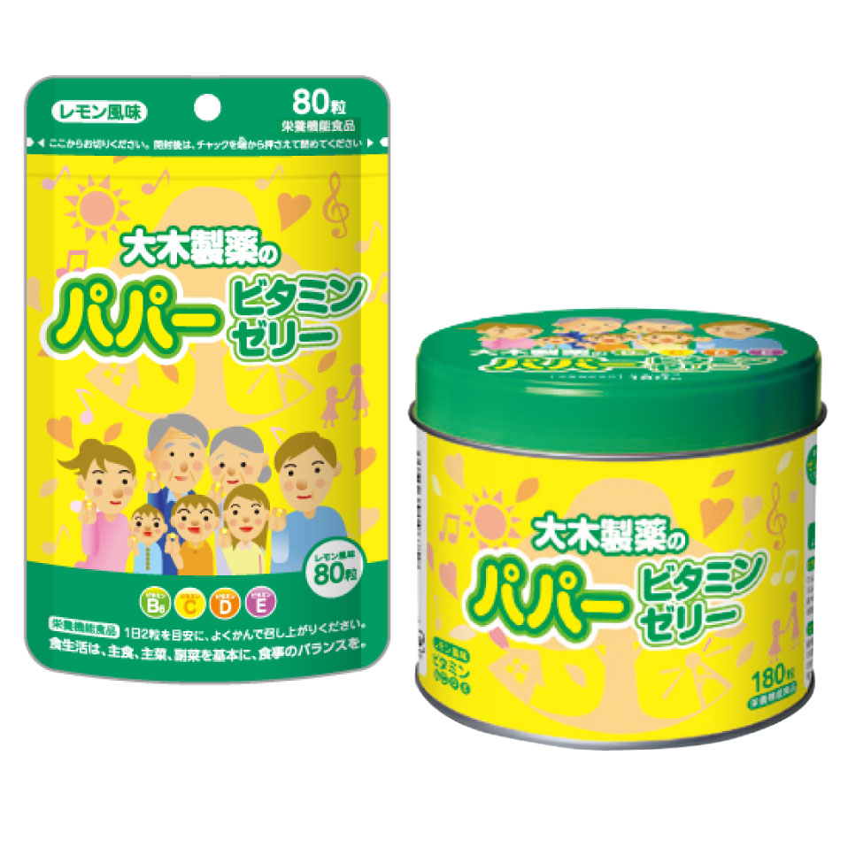 パパービタミンゼリー レモン風味は、ビタミンB6、C、D、Eをバランス良く配合した寒天素材のゼリータイプの栄養機能食品で、甘酸っぱくてあとくちが良く、水なしで、かんで召し上がれます。