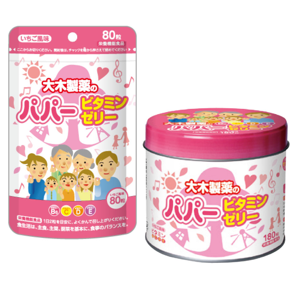 パパービタミンゼリー いちご風味は、ビタミンB6、C、D、Eをバランス良く配合した寒天素材のゼリータイプの栄養機能食品で、おいしいいちご風味です。水なしで、かんで召し上がれます。